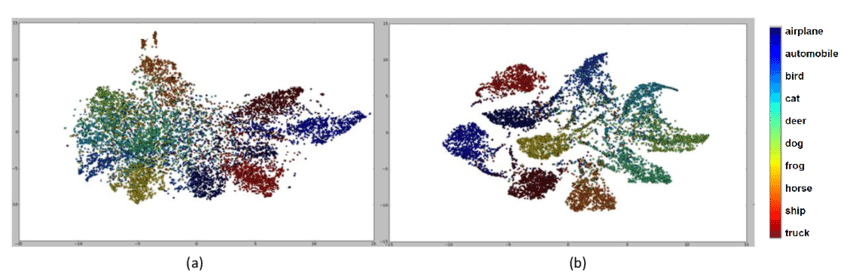 어떤 모델이 더 잘 표현을 하고 있는 걸까요? 직관적으로 (b) 모델 처럼 분류가 깔끔하게 되면 각각의 클래스들을 구분하기가 훨씬 쉬울 것 같습니다. 실제로, (b) 모델의 정확도가 훨씬 높습니다.