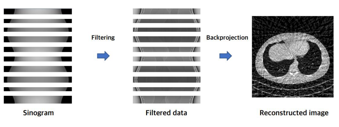 CT를 얻는 방법을 한 줄로 요약하면 "projection들로 sinogram을 만들고 reconstruction하여 CT를 얻는다" 입니다. 이에 대해 심화 이론 없이 간단하게 알아보겠습니다.